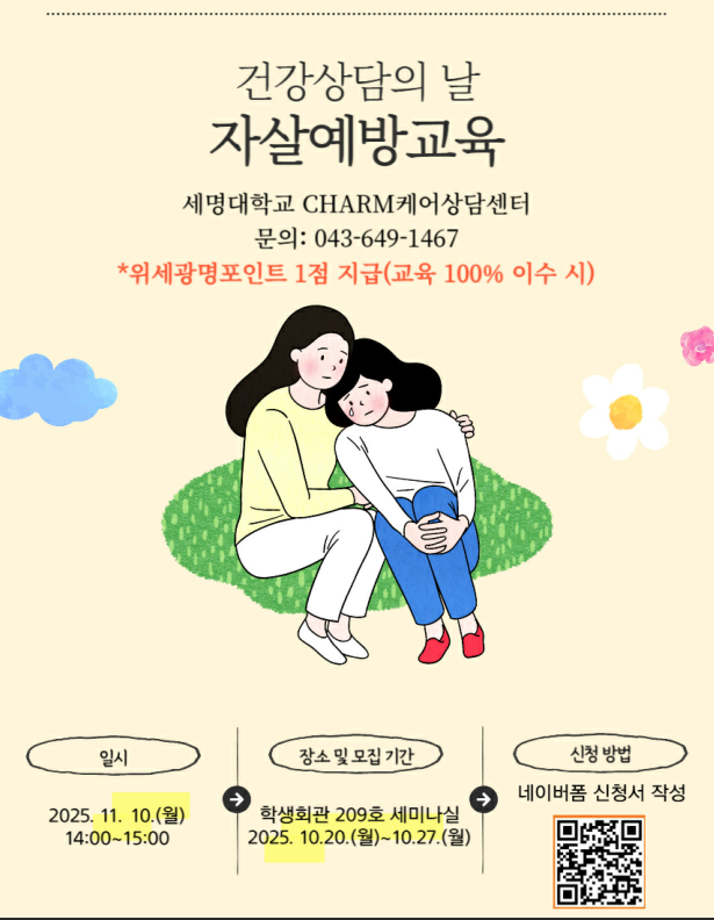 본문 시작 홈으로 학과생활 학과소개 교수소개 교과과정 학과생활 홈페이지가이드 사진게시판 공지사항 사진게시판 전공자료실 동아리 학과행사 사진게시판 페이스북 트위터 프린트 [CHARM케어상담센터] 2025학년도 2학기 자살예방교육 진행 안내 산업디자인학과 141 2025-10-21 목록 이전[긴급공지] 최근 급증 중인 '캄보디아 불법 고용, 납치' 사례 주의 안내 다음 [CHARM케어상담센터] 2025학년도 2학기 알코올중독 예방 및 스트레스 대처 관련 교육 진행 안내 담당부서 : 산업디자인학과 담당자 : - 연락처 : 043-649-1436 최종수정일 : 2024-10-26 만족도조사 만족도 조사 이 페이지에서 제공하는 정보에 대하여 만족하시나요? 매우만족 만족 보통 불만족 매우불만족