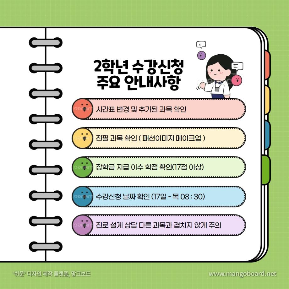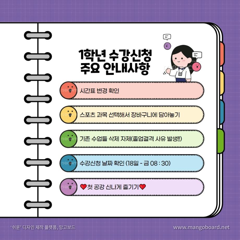 본문 시작 홈으로 커뮤니티 학과소개 교수소개 학과과정 커뮤니티 대학원 홈페이지가이드 포토갤러리 공지사항 채용정보 포토갤러리 Youtube 바로가기 Instargram 바로가기 Blog 바로가기 Facebook 바로가기 포토갤러리 페이스북 트위터 프린트 🌻2023년도 2학기 수강신청 안내 🌻 뷰티케어학 2747 2023-08-09 - 08. 09 ~ 08. 11 [장바구니] - 08. 17 ( 08 : 30 ) [2학년 수강신청] - 08. 18 ( 08 : 30)) [1학년 수강신청] 8월 18일은 모든 학년이 수강신청 가능합니다. 여러분 즐거운 방학 보내고 계신가요~? 수강신청이 얼마 남지 않은 지금 ! 이 내용 꼭 참고하셔서 좋은 결과 있길 바라겠습니다 💖 따로 궁금한 점이 있으시면 편하게 댓글 남겨주세요 ! 목록 이전원주 MBC 아카데미 뷰티스쿨 입시설명회 이전2023 세:티져 프로젝트 숏폼 콘텐츠 공모전