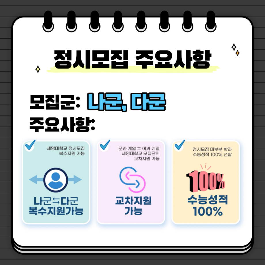 본문 시작 홈으로 커뮤니티 학과소개 교수소개 학과과정 커뮤니티 대학원 홈페이지가이드 포토갤러리 공지사항 채용정보 포토갤러리 Youtube 바로가기 Instargram 바로가기 Blog 바로가기 Facebook 바로가기 포토갤러리 페이스북 트위터 프린트 세명대학교 2024학년도 정시모집 안내 뷰티케어학 2783 2023-11-28 2024학년도 정시모집 안내입니다. 원서접수 기간을 비롯한 주요 사항이 나와 있으니 꼭! 확인하시기 바랍니다:) 목록 이전2024학년도 세명대학교 수시모집 최초합격자 등록 안내 다음 더 가까워진 세명대학교!
