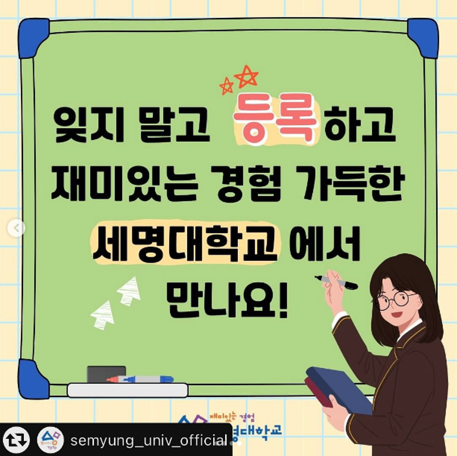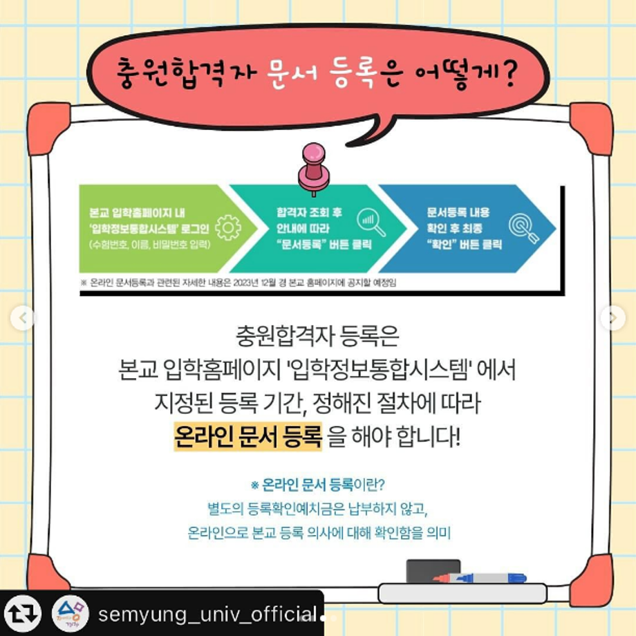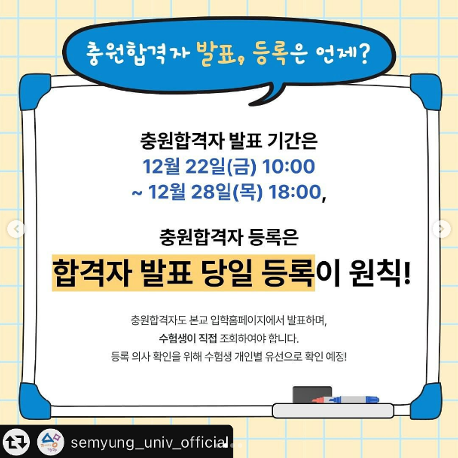 본문 시작 홈으로 커뮤니티 학과소개 교수소개 학과과정 커뮤니티 대학원 홈페이지가이드 포토갤러리 공지사항 채용정보 포토갤러리 Youtube 바로가기 Instargram 바로가기 Blog 바로가기 Facebook 바로가기 포토갤러리 페이스북 트위터 프린트 📢 2024학년도 세명대학교 수시모집 충원합격자 발표 및 등록 안내 뷰티케어학 2718 2023-12-22 2024학년도 수시모집 충원합격자 발표 및 등록 안내입니다👍 ✔12월 22일(금) 10:00부터 28일(금) 18:00✔까지 충원합격자 발표! 충원합격자 등록은 👉합격자 발표 당일 등록!!👈 잊지 말고 등록하고 ✨재미있는 경험 가득한 💙세명대학교💙에서 만나요! 목록 다음 더 가까워진 세명대학교! 다음 세명대학교도 지구를 위해 함께합니다!