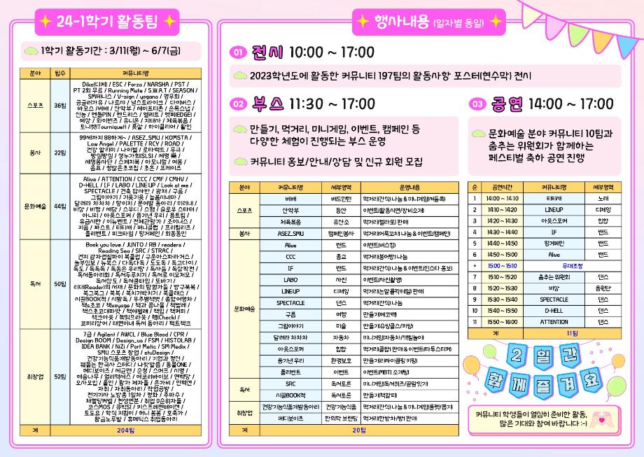 본문 시작 홈으로 커뮤니티 학과소개 교수소개 학과과정 커뮤니티 대학원 홈페이지가이드 포토갤러리 공지사항 채용정보 포토갤러리 Youtube 바로가기 Instargram 바로가기 Blog 바로가기 Facebook 바로가기 포토갤러리 페이스북 트위터 프린트 커뮤니티 페스티벌✨ 뷰티케어학 1849 2024-04-01 커뮤니티 페스티벌 4월 2~3일 봄을 맞아 새로운 행사가 열립니다! 여러 부스 활동들과 먹거리, 공연등이 펼쳐지니 많은 관심과 참여 부탁드립니다:) 전시,부스 종류와 공연시간등을 잘 참고하셔서 즐기시길 바래요✨ 전시-10:00~17:00 부스-11:30~17:00 공연-14:00~16:00 📍뭐든지 광장 (위치는 지도 참고) 목록 이전💫모듈형 교육과정 뷰티영양학 토론수업💫 다음 벚꽃세봄✨