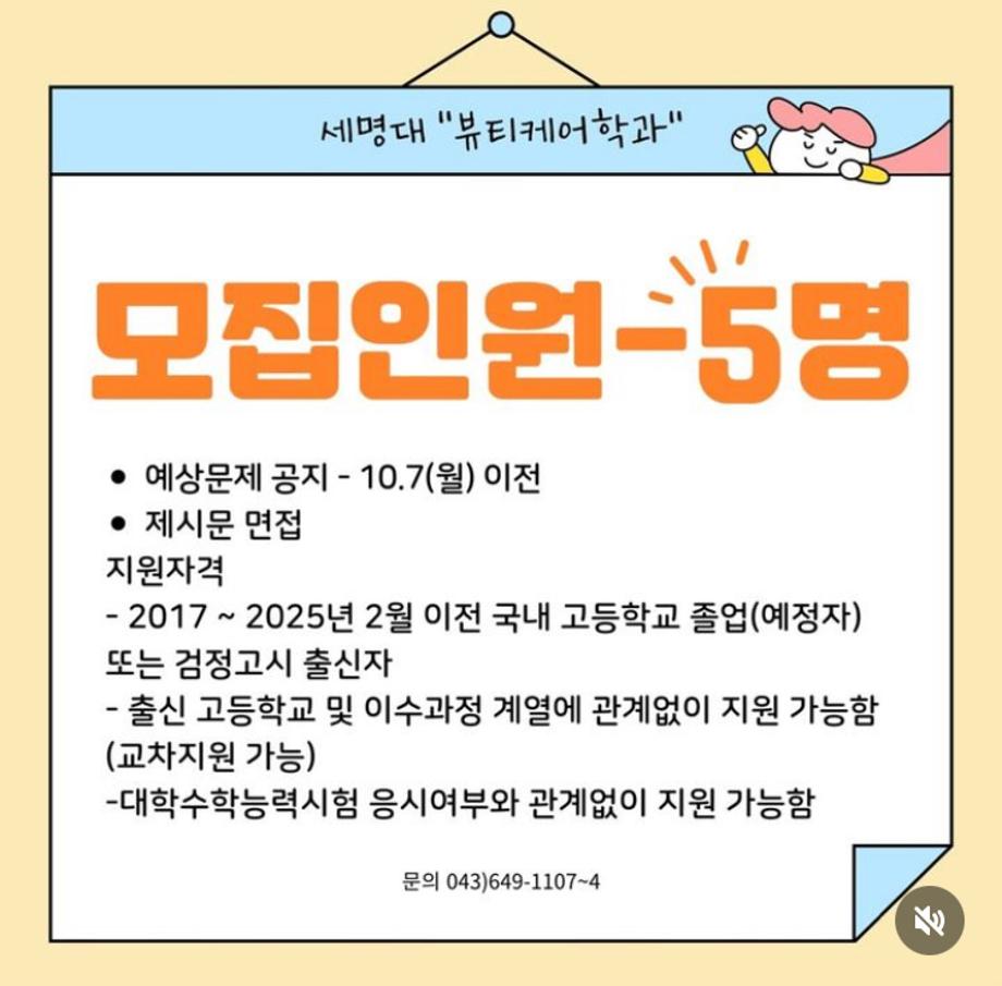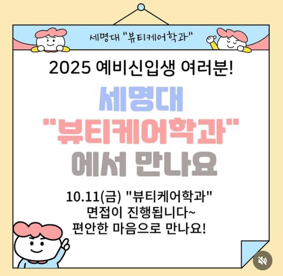 본문 시작 홈으로 커뮤니티 학과소개 교수소개 학과과정 커뮤니티 대학원 홈페이지가이드 포토갤러리 공지사항 채용정보 포토갤러리 Youtube 바로가기 Instargram 바로가기 Blog 바로가기 Facebook 바로가기 포토갤러리 페이스북 트위터 프린트 📣 2025 세명대학교 “뷰티케어학과” 면접우수자전형 면접 일정 📣 바이오코스메틱학과 1886 2024-10-02 📣 2025 세명대학교 “뷰티케어학과” 면접우수자전형 면접 일정 📣 면접우수자전형 면접은 10.11(금) 입니다!! 많은 관심과 지원 부탁드리겠습니다!! 2025 예비 세명인 여러분 “뷰티케어학과” 에서 만나요🫶🏻🫶🏻 목록 이전면접 우수자 전형 다음 헤어기초커트1