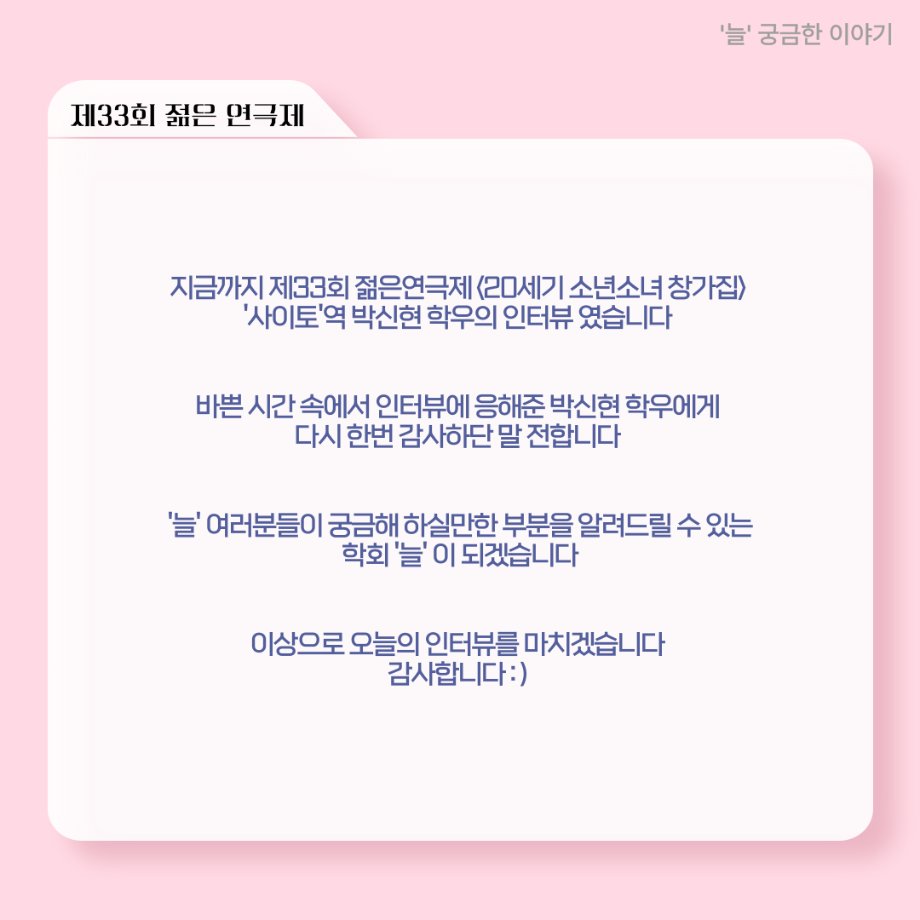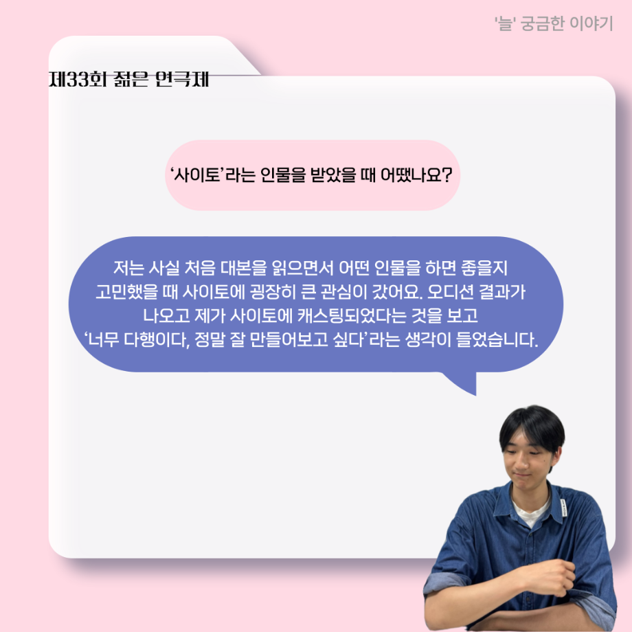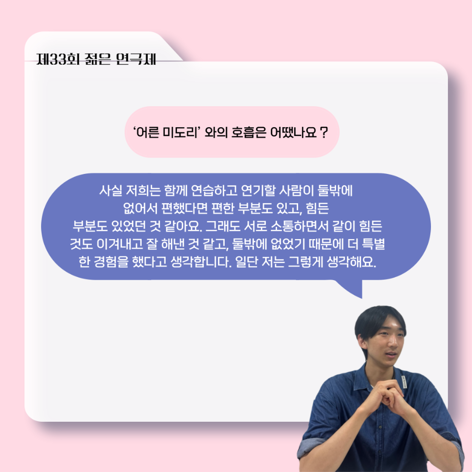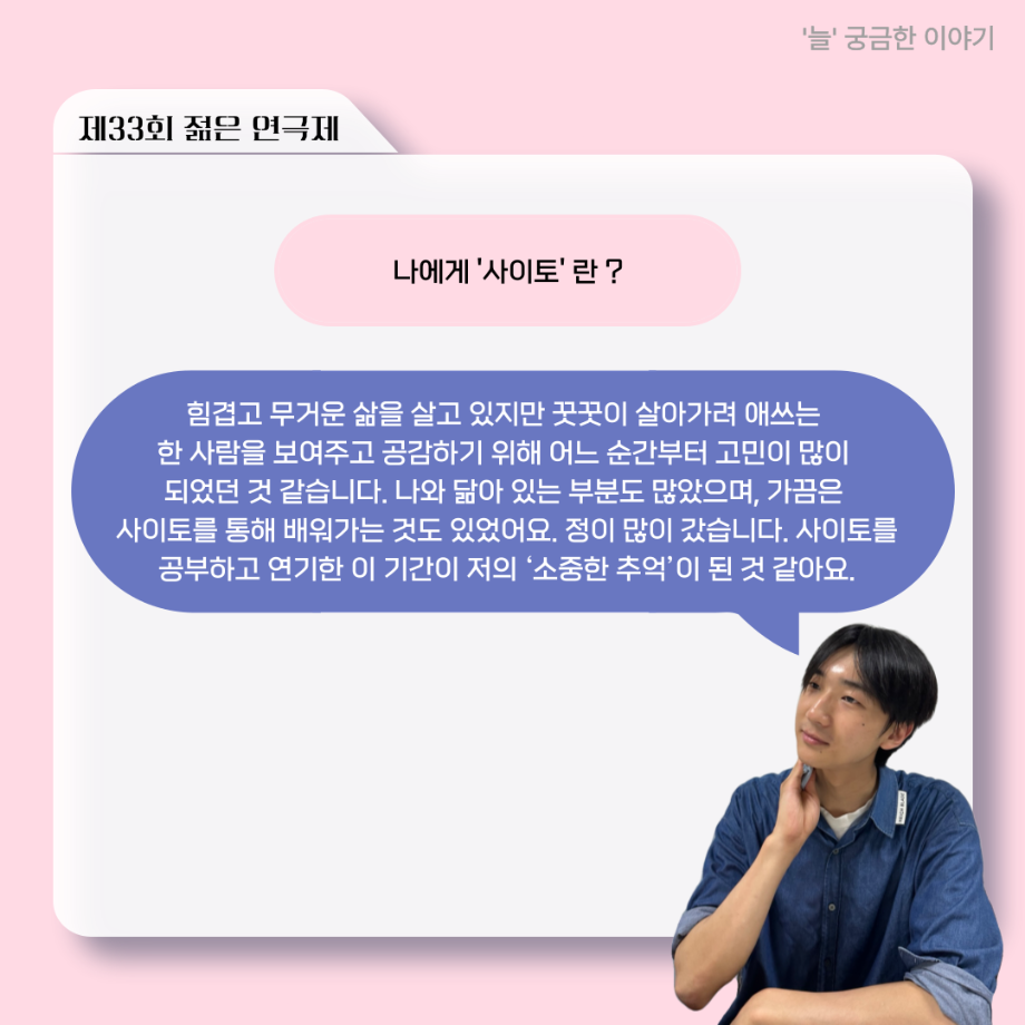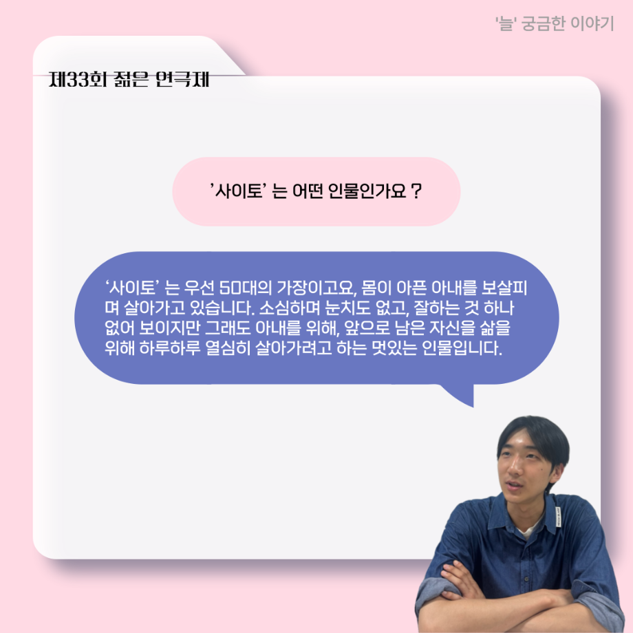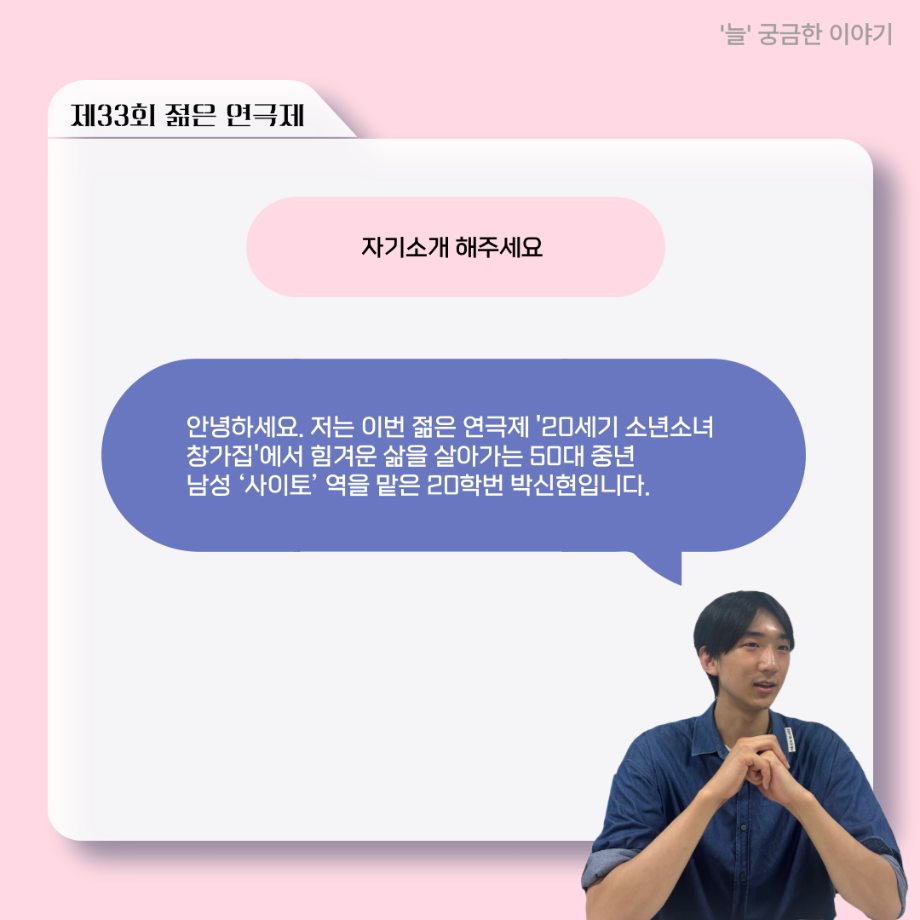본문 시작 홈으로 커뮤니티 학과소개 입학정보 교수소개 학과과정 커뮤니티 공연예매 안내 홈페이지가이드 포토갤러리 공지사항 포토갤러리 작품DB 동아리 학사일정 학생회 포토갤러리 페이스북 트위터 프린트 ‘늘‘ 궁금한 이야기 - 젊은연극제 ‘20세기 소년소녀 창가집’ 사이토 役 < 박신현 > 연기예술학과 488 2025-08-15 . 목록 다음 2025년 세명대학교 연기예술학과 2학기 개강총회 다음 ‘늘‘ 궁금한 이야기 - 젊은연극제 ‘20세기 소년소녀 창가집’ 종이연극 아저씨 役 < 윤준호 > 담당부서 : 연기예술학과 담당자 : 박솔빈 연락처 : 043-649-1733 최종수정일 : 2024-10-26 만족도조사 만족도 조사 이 페이지에서 제공하는 정보에 대하여 만족하시나요? 매우만족 만족 보통 불만족 매우불만족