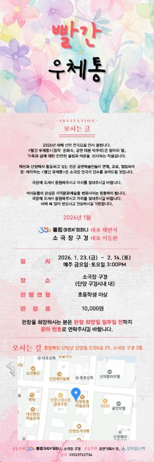 본문 시작 홈으로 MCC News 학과소개 교수소개 학과과정 MCC News MCC SNS 홈페이지가이드 교수 및 졸업생 학과 및 재학생 교수 및 졸업생 미디어 정보통 교수 및 졸업생 페이스북 트위터 프린트 권화숙 교수님 희곡 빨간우체통 공연 안내 미디어콘텐츠창작학과 916 2026-01-16 권화숙 교수님께서 작성하신 희곡 작품 '빨간우체통'이 연극무대에 올려지게 되었습니다. 자세한 내용은 위 사진을 참고해주시면 됩니다. 목록 이전권화숙 교수님 향기로운 삶, 문인화 전시회 안내 담당부서 : 미디어콘텐츠창작학과 담당자 : - 연락처 : 043-649-1741 최종수정일 : 2024-10-26 만족도조사 만족도 조사 이 페이지에서 제공하는 정보에 대하여 만족하시나요? 매우만족 만족 보통 불만족 매우불만족