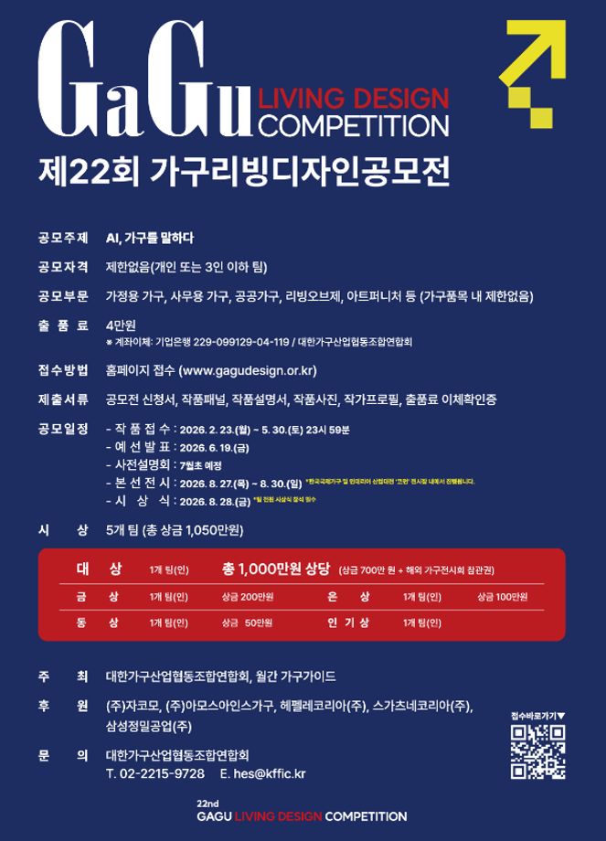 본문 시작 홈으로 교과과정 학과소개 교수소개 교과과정 학과생활 홈페이지가이드 전시회 진로 교육과정 전공교육 체계도 자격증 전시회 공모전/과제전 졸업작품전시회 공모전/과제전 공모전/과제전 페이스북 트위터 프린트 [공모전] 제22회 가구리빙디자인공모전 산업디자인학과 9 2026-03-03 LINK:가구리빙디자인공모전 GaGa LIVING DESIGN COMPETITION 첨부파일:(붙임)_제22회_가구리빙디자인공모전_공모요강_등.zip 목록 이전[공모전] 봉은사 사천왕 캐릭터 공모전 다음 [공모전] 제18회 대전광역시 공공디자인 공모전 만족도조사 만족도 조사 이 페이지에서 제공하는 정보에 대하여 만족하시나요? 매우만족 만족 보통 불만족 매우불만족