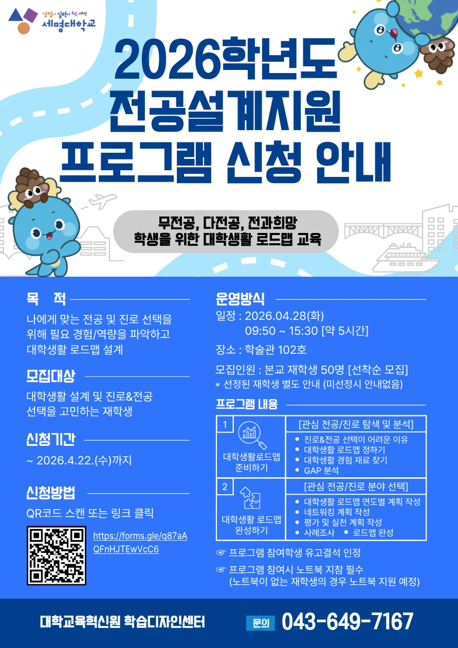 본문 시작 공지사항 세명소개 입학/취업 대학/대학원 학사지원 대학생활 연구/산학 기관/시설 SMU Story 소통·공감 학교기업 홈페이지가이드 일반공지 News@SMU 공지사항 보도자료 Media SMU 민송백일장 해카톤 경진대회 일반공지 페이스북 트위터 프린트 🌟2026학년도 전공설계지원(무전공, 다전공, 전과희망 학생을 위한 대학생활 로드맵 교육) 프로그램 재안내🌟 교육혁신팀 조회:41 등록일:2026-04-20 신청링크 : https://forms.gle/cdbvvzSTfquYasMc9 목록 담당부서 : 세명대학교 담당자 : 세명대학교 연락처 : 043-645-1125 최종수정일 : 2024-10-26 만족도조사 만족도 조사 이 페이지에서 제공하는 정보에 대하여 만족하시나요? 매우만족 만족 보통 불만족 매우불만족
