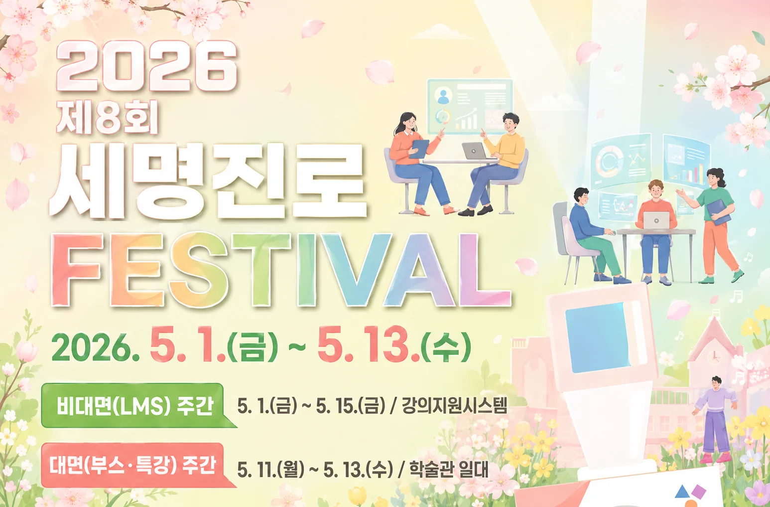 나. 비대면특강 : 강의지원 ▶ 교육현황 ▶ 개설과목검색 ▶ 비정규과목 ▶[2026 세명진로 Festival_강의명] 검색 ▶ 안내사항 필독 ▶ 신청하기